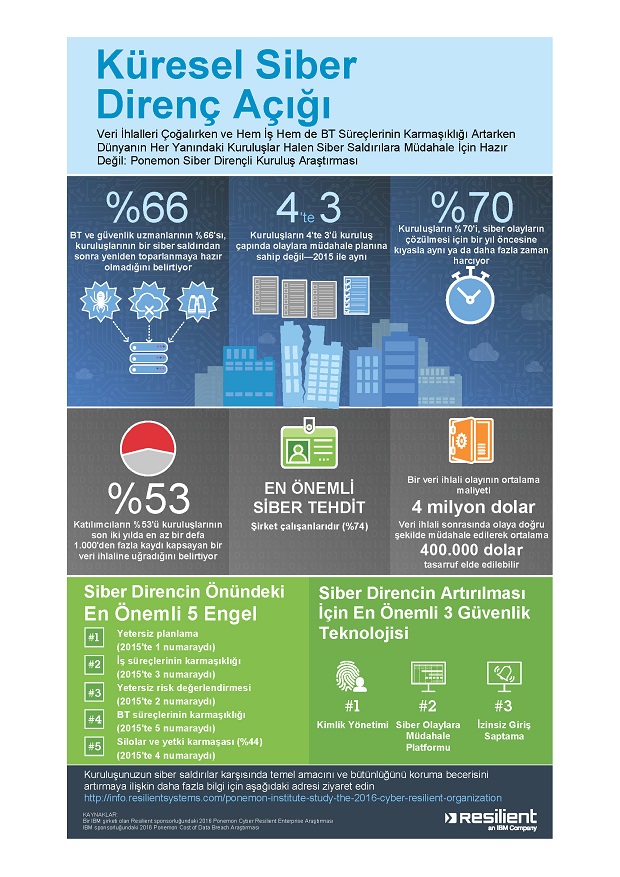 Ponemon Enstitüsü tarafından Resilient firmasının sponsorluğunda gerçekleştirilen 2016 Siber Dirençli Kuruluş Araştırması, siber dirence, bir başka deyişle bir kuruluşun siber saldırılar karşısında temel amacını ve bütünlüğünü sürdürme becerisine ilişkin bir karşılaştırmalı değerlendirme araştırması niteliğinde. Küresel araştırma; ABD, İngiltere, Fransa, Almanya, Birleşik Arap Emirlikleri, Brezilya ve Avustralya dahil olmak üzere dünyanın her yanından 2.400’den fazla güvenlik ve BT profesyonelinin öngörülerini kapsıyor.