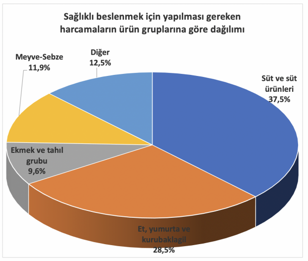 Daha dar bir gruplandırmaya göre harcamalarda süt ve süt ürünlerinin payı yüzde 37,5 ile en yüksek paya sahiptir. Sebze ve meyvenin harcamalar içindeki payı yüzde 11,9 olmuştur.