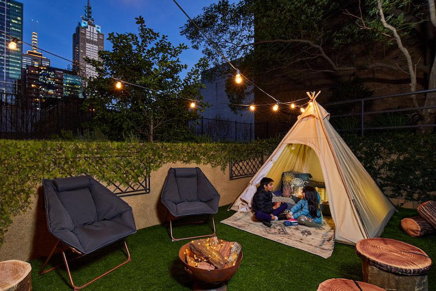 Melbourne Marriott Hotel, dört duvar arasında sıkışmaktan sıkılan ailelere şehirde büyüleyici bir deneyim sunuyor. Fiyatı 299 dolar olarak belirleyen bu paketi satın alan aile, 5 yıldızlı odada çocuklarıyla muhteşem çadırlı özel deneyim yaşıyor. Pakette Teepee çadırlı özel avlu, iki büyük çift kişilik yatak, yastık, battaniye, 2 çocuk uyku tulumu, peri ışıklı ateş çukuru, bireysel avlu ortam aydınlatması. Ebeveynler için dinlenme kampı sandalyeleri. Piknik masası, oyun ve kutu oyunlar. Böylece bu paketi satın alan aileler, ister yıldızların altında açık havaya kurulan lüks çadırda, isterlerse de içerdeki odalarında yatıp günün yoğunluğunu atacakları farklı bir gece yaşamış oluyorlar.