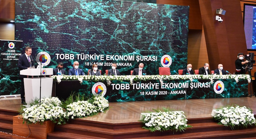 Türkiye Odalar ve Borsalar Birliği (TOBB) Başkanı M. Rifat Hisarcıklıoğlu, Cumhurbaşkanı Recep Tayyip Erdoğan ve bazı bakanların katılımıyla TOBB İkiz Kuleler’de düzenlenen TOBB Türkiye Ekonomi Şurası’nın açılışında yaptığı konuşmada, “Sizin önderliğinizde başlatılacak, cesur ve ezber bozan, yeni bir yapısal reform hamlesi, küresel rekabette bizi öne çıkaracaktır. Bu noktada son olarak şunu vurgulamak isterim. Mevzuata ilişkin yapılacak reformlarda, eskiden olduğu gibi, kamu-özel sektör diyalog mekanizmalarının kurulması ve sin her zaman vurguladığımız istişarenin güçlendirilmesi çok faydalı olacaktır” dedi.TOBB Başkanı M. Rifat Hisarcıklıoğlu’nun ev sahipliğindeki Türkiye Ekonomi Şurası; Cumhurbaşkanı Recep Tayyip Erdoğan, Cumhurbaşkanı Yardımcısı Fuat Oktay, Hazine ve Maliye Bakanı Lütfi Elvan, Tarım ve Orman Bakanı Bekir Pakdemirli, Ticaret Bakanı Ruhsar Pekcan, Kültür ve Turizm Bakanı Mehmet Nuri Ersoy, Sanayi ve Teknoloji Bakanı Mustafa Varank, Ulaştırma ve Altyapı Bakanı Adil Karaismailoğlu ve TOBB Yönetim Kurulu Üyelerinin katılımıyla TOBB İkiz Kuleler Konferans Salonu’ndan video konferans aracılığıyla gerçekleştirildi.
